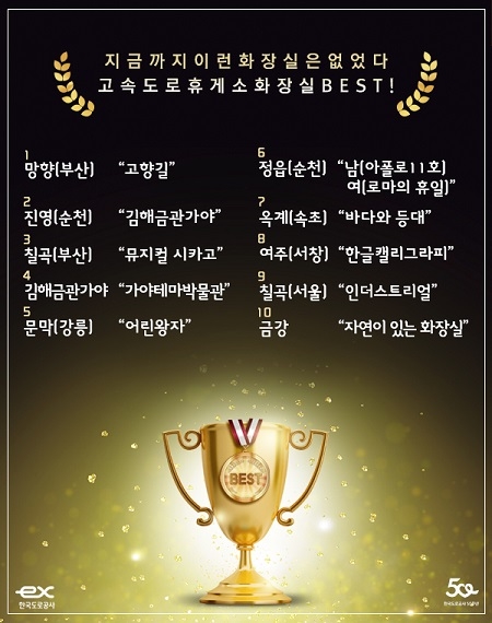 한국도로공사가 창립 50주년 기념으로 진행한 '느낌 있는 화장실 BEST 10' 선정 결과를 13일 발표했다.