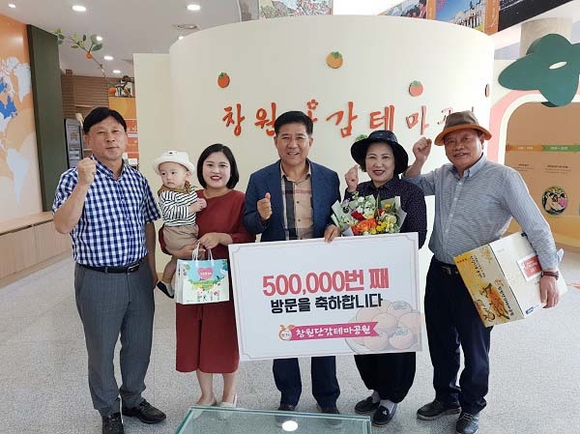 창원단감테마공원은 50만 번째 방문객이 탄생한 지난 11일 황규종 농업기술센터소장과 공원관리 직원들이 참석한 가운데 50만 번째 방문객 축하행사를 열고 단감가공품과 단감 교환권 등을 증정했다.