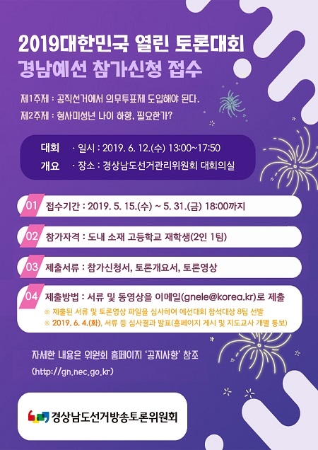 경남도선거방송토론위원회는 6월 12일 도선관위 6층 대회의실에서 도내 고등학생을 대상으로 '2019 대한민국 열린 토론대회 경남지역 예선대회'를 개최한다.