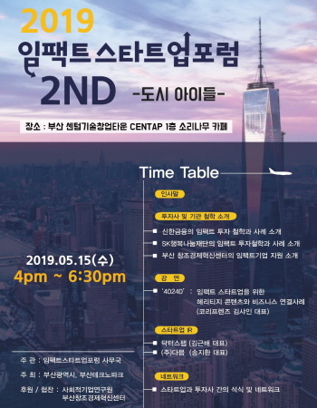 (재)부산테크노파크가 오는 15일 오후 4시 해운대구 센탑(CENTAP)에서 전국적인 혁신 창업 분위기 조성을 위한 ‘임팩트 스타트업 포럼’을 개최한다고 14일 밝혔다.