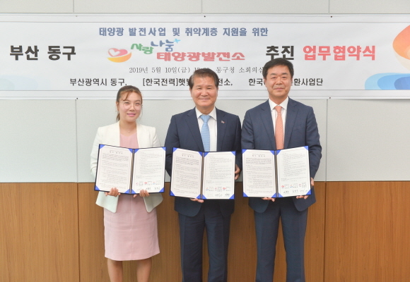 부산 동구는 지난 10일 구청 소회의실에서 한국전력 햇빛새싹발전소, 한국에너지전환사업단(유)과 함께 ‘사랑 나눔 태양광발전소 구축 프로젝트’ 업무 협약을 맺었다고 14일 밝혔다.