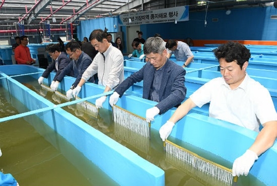 이날 종자 채묘는 미역 유주자(포자) 방출 시기에 맞춰 기장 해역의 미역 모조에서 채취한 미역포자(유주자)를 활용해 진행한다.