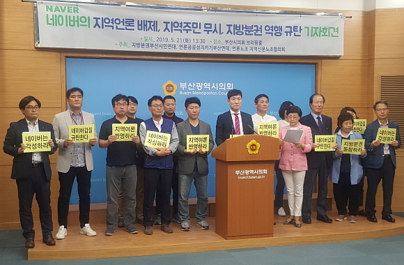 지방분권부산시민연대, 전국언론노조 지역신문노동조합 등은 21일 오후 부산시의회 브리핑실에서 기자회견을 열고 네이버의 지역 언론 모바일 배제에 대해 규탄하는 목소리를 냈다.