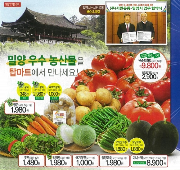 경남 밀양시는 지난달 ㈜서원유통과의 '농산물 공급확대 등 상생협력·교류 MOU' 이후 밀양 우수농산물 직거래 판매행사를 적극 추진하고 있어 시민들로부터 많은 호응을 얻고 있다고 21일 밝혔다.