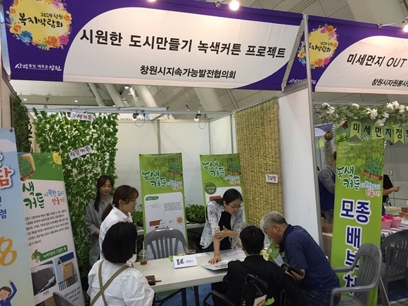 경남 창원시는 창원시지속가능발전협의회와 함께 추진하는 녹색커튼사업의 성공적 추진을 위해 세코에서 열린 2019 창원복지박람회에서 홍보부스를 운영하고 여주, 수세미 등의 모종 1000개를 배부했다고 22일 밝혔다.