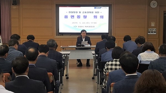 경남 창원시는 22일 시청에서 대민접점 업무를 수행하는 58개 읍면동장과 구청 행정과장 등이 참석한 가운데 현장행정 및 소통강화를 위한 읍면동장 회의를 개최했다.