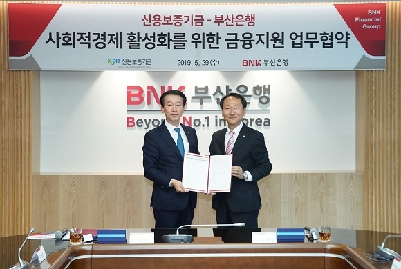 BNK부산은행과 신용보증기금(신보)이 29일 오후 부산은행 본점에서 ‘사회적 경제기업 활성화를 위한 금융지원 업무협약’을 체결했다고 밝혔다.