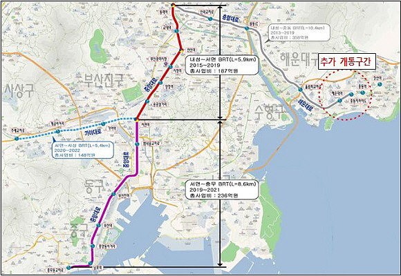최근 부산 BRT 운촌삼거리~중동지하차도 구간 공사가 끝남에 따라 동래 내성교차로에서 해운대 중동지하차도 10.4㎞ 구간의 BRT 1개축이 완성됐다.
