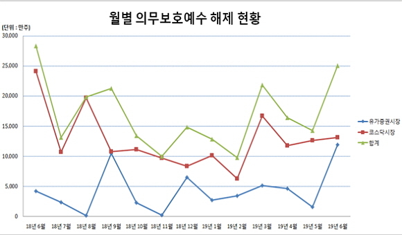 내달 중 의무보호예수가 해제되는 주식 수량은 전월대비 75.6%(1억 797만주) 증가했으며 전년동월대비 11.6%(3280만주) 감소한 것으로 집계됐다.