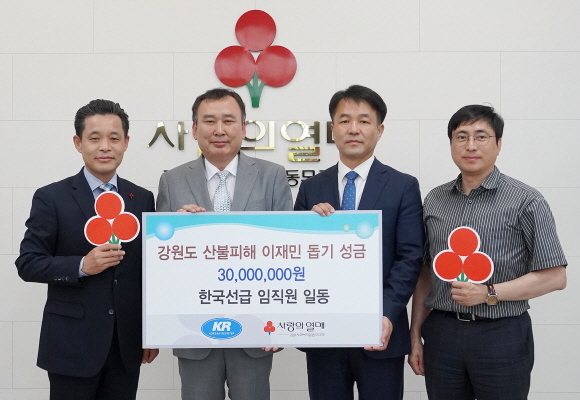 한국선급이 지난 30일 강원도 사회복지공동모금회에 강원 산불피해 이재민 돕기 성금 3000만원을 전달했다고 31일 밝혔다.