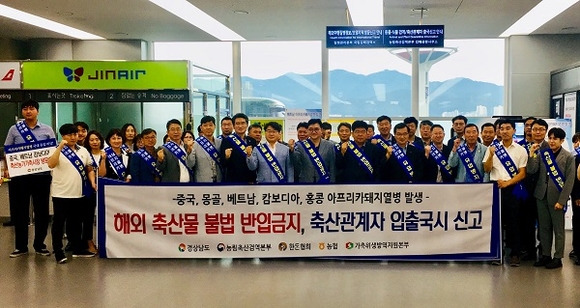 경남도가 아프리카돼지열병(ASF)의 선제적인 예방활동으로 31일 김해국제공항에서 해외여행객을 대상으로 유입 방지 대국민 캠페인을 벌였다.