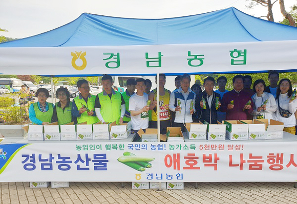 경남농협은 1일 진주시 진양호 무지개동산에서 열린 '남부내륙고속철도 조기착공 기원 전국마라톤대회'에 참가해 우리 농산물 나눔행사를 펼쳤다.