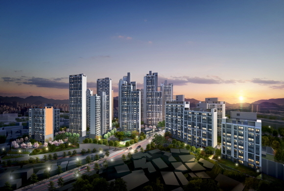 단지는 지하 5층~지상 35층, 17개동, 전용면적 59~107㎡로 1단지 1286가구, 2단지 115가구 총 1401가구다. 그 가운데 조합 473가구, 일반분양 856가구, 임대 72가구로 구성됐다.