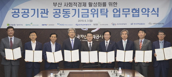 한국자산관리공사(캠코), 기술보증기금(기보), 예탁결제원, 부산도시공사 등 부산 8개 공공기관이 3일 오후 3시 부산국제금융센터(BIFC)에서 ㈔사회적기업연구원과 사회적경제 활성화를 위한 공동기금 위탁 협약식을 체결했다.