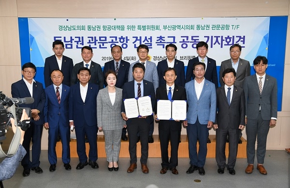 경남도의회 동남권 항공대책을 위한 특별위원회는 4일 도의회 브리핑룸에서 부산시의회 동남권 관문공항 T/F와 공동기자회견을 열어 '동남권 관문공항 건설 촉구 공동결의문'을 발표했다.