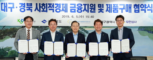 신용보증기금(신보)와 대구시, 경북도, 사회적경제기업조합이 5일 대구시청에서 ‘대구·경북 사회적경제기업 금융지원, 제품 구매를 위한 업무협약’을 체결했다고 밝혔다.