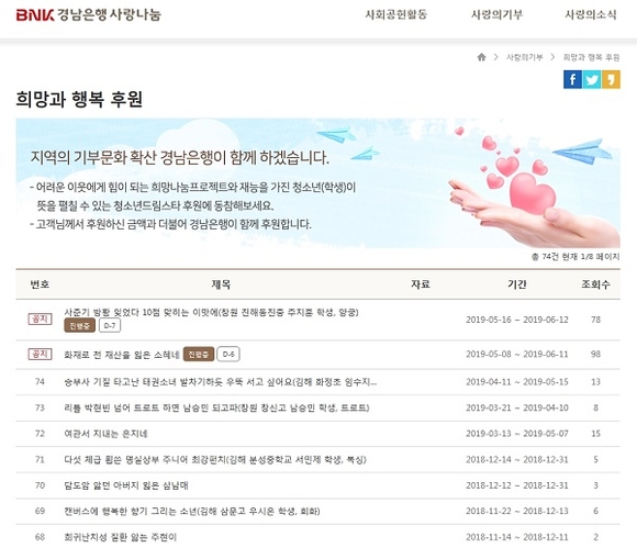 경남은행은 홈페이지 내에 '희망과 행복 후원' 코너를 설치하고 지역민과 고객에게 '희망나눔프로젝트'와 '청소년드림스타사업' 사연을 소개, 사회적배려대상자세대와 문학·예술·체육 등 분야 재능 꿈나무(청소년) 후원을 유도하고 있다.