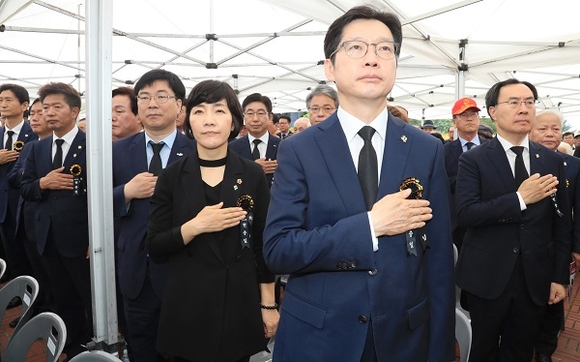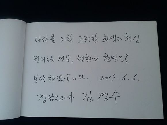 이날 추념식에 앞서 김경수 도지사는 충혼탑 방명록에 “나라를 위한 고귀한 희생과 헌신, 정의로운 경남과 평화의 한반도로 보답하겠습니다”라고 적었다.
