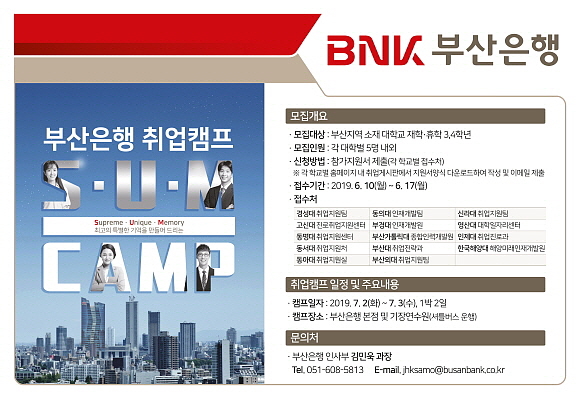 BNK부산은행이 지역 대학생들의 원활한 취업 활동을 돕기 위해 마련한 체험형 취업 역량 개발 프로그램 ‘SUM CAMP’에 참가할 대학생을 모집한다고 7일 밝혔다.