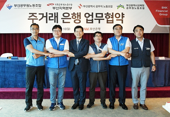 BNK부산은행이 10일 오후 부산은행 본점에서 부산공무원 노동조합, 전국 공무원 노동조합 부산본부, 부산시 공무직 노동조합, 부산시교육청 공무원 노동조합과 ‘주거래 은행 업무협약’을 체결했다고 밝혔다.