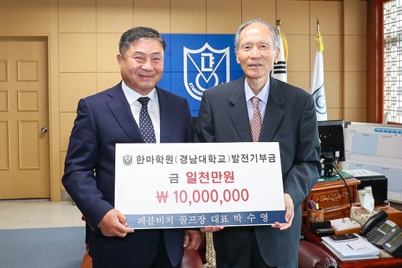 학교법인 한마학원은 10일 오후 3시 30분 경남대 총장실에서 페블비치골프장 박수영 대표로부터 법인 발전기금 1000만 원을 전달받았다.
