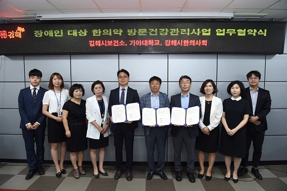 김해시보건소는 10일 오전 시청 사업소동 소회의실에서 김해시한의사회, 가야대학교와 재가 장애인 보건의료서비스 업무협약을 체결했다.
