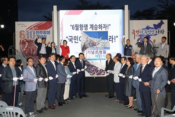 특히 지난 2017년 6월 민주항쟁 30주년을 맞아 설치된 표석(마산합포구 창동사거리)에 이어 민주주의정신 100년을 기념해 6월 민주항쟁 32주년 기념 조형물이 경남대 10‧18 장승터에 설치됐다.