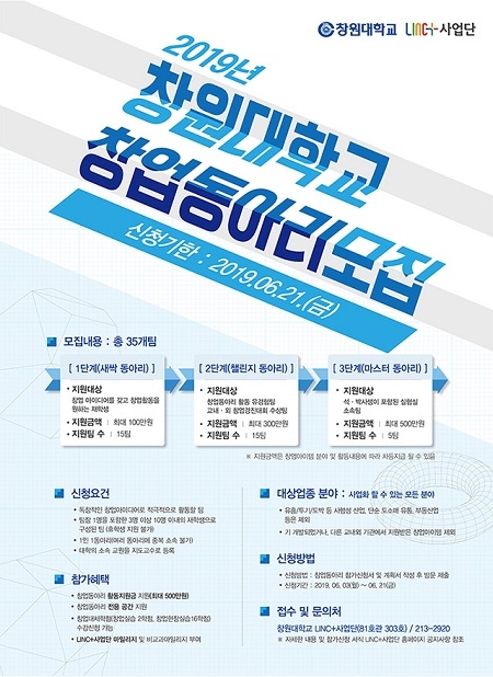 창원대학교는 12일 '2019년 창업동아리'를 모집하고 재학생들의 창업역량 강화에 나선다고 밝혔다.