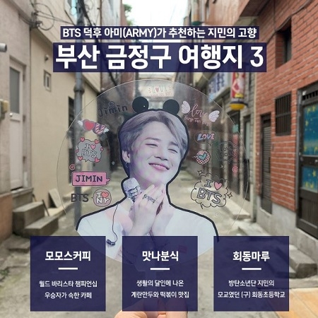 부산관광공사는 먼저 금정구 출신인 지민의 모교인 (구)회동초등학교, 회동마루를 시작으로 서동 미로시장, 모모스 커피를 추천했다. 이는 시내버스 179번 버스로 이동할 수 있다.