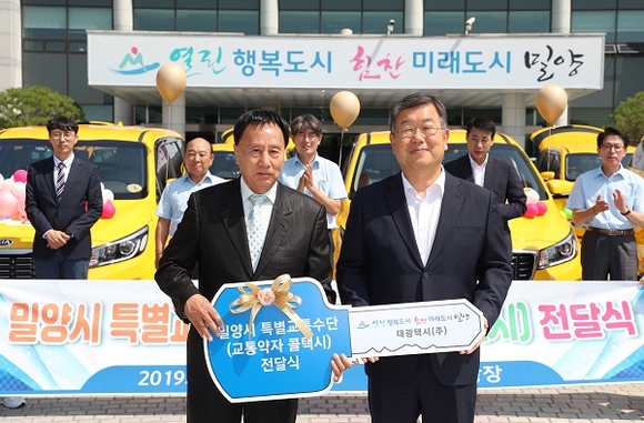 경남 밀양시는 13일 시청 광장에서 교통약자의 이동편의 증진을 위한 교통약자 콜택시 노후차량 8대를 신규차량으로 교체하고 위탁기관인 대광택시(주)에 전달했다.