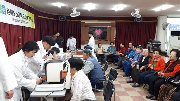 춘해보건대학교 안경광학과는 6월 14일 울주군 이친구 무료급식소에서 어르신 120여명을 대상으로 무료시력검안 및 돋보기 증정 봉사활동을 펼쳤다.