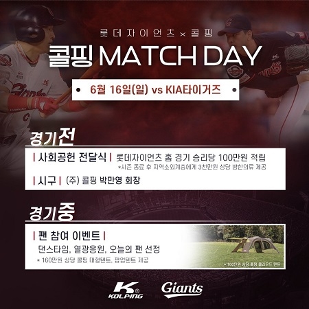 롯데 자이언츠가 오는 16일 사직야구장에서 열리는 KIA와의 홈 경기를 ‘콜핑 매치데이’로 지정하고 다양한 팬 이벤트와 사회공헌활동을 한다고 14일 밝혔다.