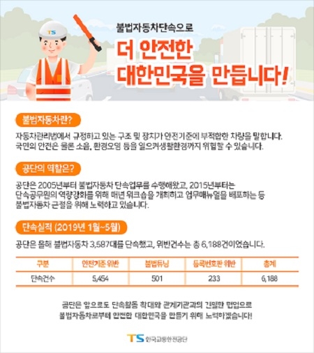 권병윤 공단 이사장은 “불법자동차는 주변차량과 보행자의 안전뿐 아니라 생활환경까지 위협할 수 있다”며 “공단은 앞으로도 단속활동 확대와 관계기관과의 긴밀한 협업으로 불법자동차로부터 안전한 대한민국을 만들기 위해 최선을 다하겠다”고 전했다.