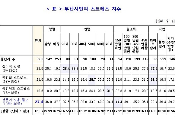 부산시민 가운데 전문가 도움이 필요한 스트레스 고위험군이 37.4%로 이들 가운데 90% 이상이 아무런 조치도 없이 견디고 있는 것으로 나타났다.