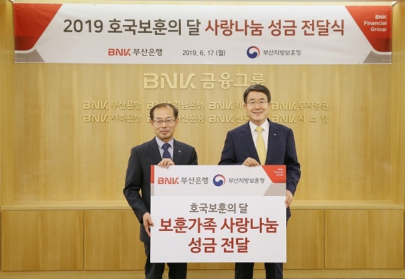 BNK부산은행이 호국보훈의 달을 맞아 17일 오전 부산은행 본점에서 부산지방보훈청에 성금 1000만원을 전달했다고 밝혔다.