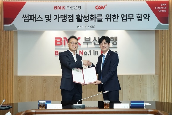 BNK부산은행과 CJ CGV가 17일 오전 부산은행 본점에서 ‘썸패스 및 가맹점 활성화를 위한 업무협약’을 체결했다고 밝혔다.