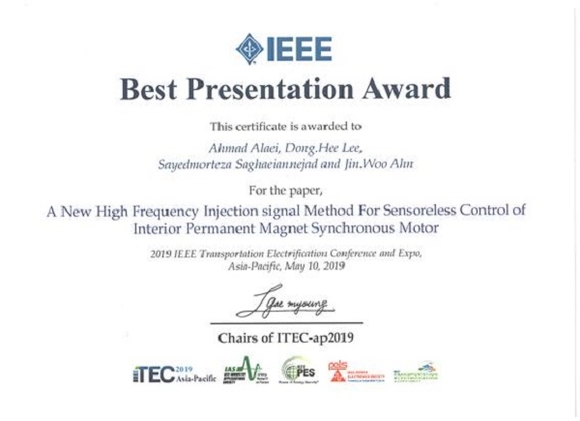 지난 5월 8일부터 10일까지 제주 국제컨벤션센터에서 국제 전기자동차 엑스포(IEVE, International Electric Vehicle Expo)와 같이 개최된 IEEE Transportation Electrification Conference and Expo, Asia-Pacific (ITEC-AP) 2019 국제학술대회는 전기자동차, 드론 등 육해공 수송기계의 전기화 관련기술을 연구하는 국제학술대회다. 한국에서는 2016년 부산 벡스코에서 부산모터쇼와 함께 처음으로 개최되었다. 알라이 교수는 이번 학술대회에서 이동희, 안진우 교수와 공동으로 연구한 “A New High Frequency Injection Signal Method for Sensorless Control of Interior Permanent Magnet Synchronous Motor”논문을 발표하여 최우수 발표상을 수상했다.