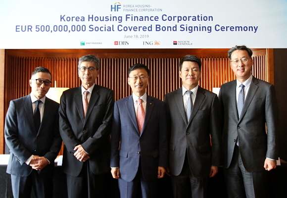 18일 부산 기장군 힐튼호텔에서 ‘해외 커버드 본드 발행 인수계약식’이 열린 가운데 이정환 한국주택금융공사 사장(중앙)과 발행 주관사 관계자들이 서명을 마치고 기념촬영을 하고 있다. 공사는 지난 11일 국제신용평가기관 ‘S&P’로부터 한국물 유로화 채권 최초로 AAA 신용등급을 받아 역대 최저수준의 금리로 5년 만기 소셜 커버드본드 5억 유로 발행에 성공했다. (사진=한국주택금융공사 제공)