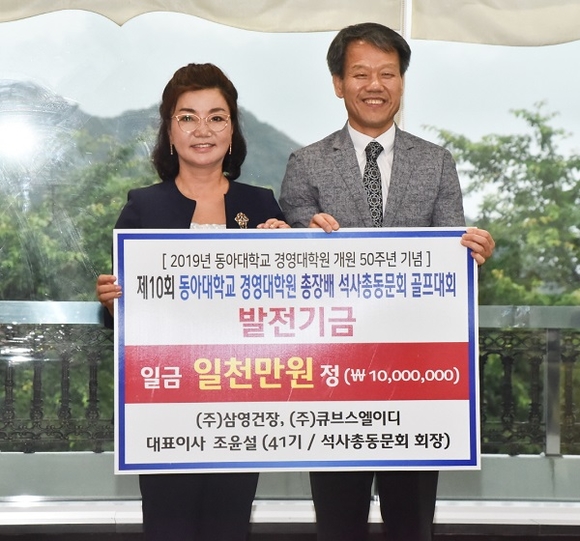 ㈜삼영건장 및 ㈜큐브스엘이디 대표를 맡고 있는 조윤설 MBA총동문회장은 지난 16일 해운대컨트리클럽에서 열린 ‘동아대학교 경영대학원 개원 50주년 기념 제10회 총장배 석사총동문회 골프대회’에서 발전기금을 전달했다.