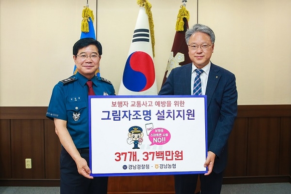 경남지방경찰청과 경남농협은 18일 경남경찰청에서 농촌지역 보행자 교통사고 예방을 위한 그림자 조명 전달식(37곳, 3700만원 상당)을 가졌다.