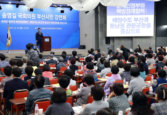 ㈔동남권관문공항추진위원회가 24일 오전 부산상공회의소(부산상의) 2층 상의홀에서 송영길 국회의원(인천 계양을, 더불어민주당)을 초청해 시민 강연회를 열었다.