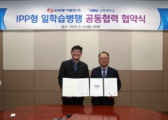 이날 협약에 따라 한국동서발전은 올 하반기부터 강원대 삼척캠퍼스 재학생을 대상으로 장기인턴 프로그램을 운영하고 장기인턴 수료자에게는 신입사원 필기전형 가점을 부여하기로 했다.