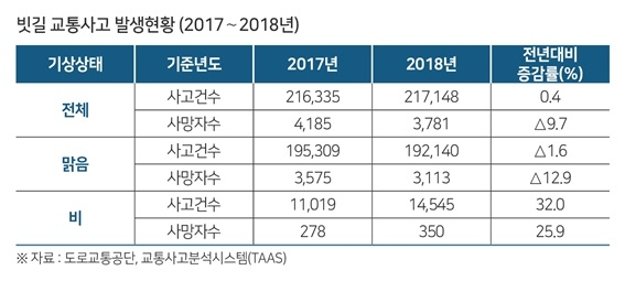 한국교통안전공단은 2018년 빗길 교통사고가 총 14,545건으로 전년대비 32.0% (3,526건), 사망자는 350명으로 25.9%(72명)가 증가했다고 밝혔다.