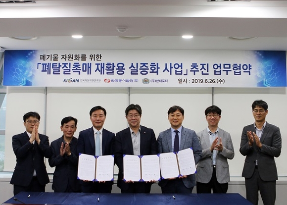 한국동서발전은 26일 11시 본사에서 한국지질자원연구원, ㈜한내포티와 ‘폐탈질촉매 재활용 사업화 협력을 위한 업무협약’을 체결하고 그 동안 적정한 재활용 기술이 없어 전량 매립되던 폐탈질촉매에서 텅스텐, 바나듐 등 유가금속을 회수해 산업소재로 재활용하는 사업을 추진한다고 밝혔다.