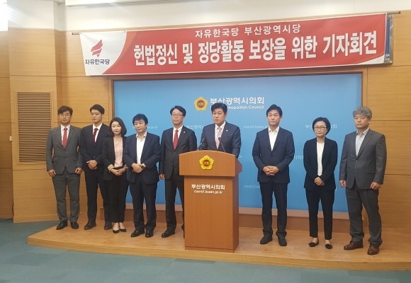 한국당 부산시당은 27일 부산시의회 브리핑실에서 기자회견을 열고 황교안 대표의 부산 방문 당시 정당 활동을 방해한 시위대 10여명과 이를 방관한 경찰을 금일 검찰에 고발했다고 밝혔다.