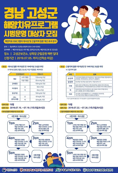 이번 프로그램은 해양치유 자원을 활용한 치유 프로그램이 대사성 및 근골격계 질환 개선 등에 미치는 효과를 검증하기 위해 각 질환별로 고성군 지역민 참가자 15명을 선착순 모집하며, 사전 건강 측정 및 의사 상담, 스마트해풍 걷기, 해변 노르딕워킹 등의 운동 프로그램과 온열 모아팩 체험, 해양치유 건강 교육 등 다채로운 프로그램이 진행될 예정이다.