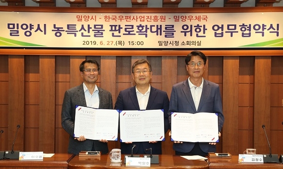 경남 밀양시는 27일 시청 소회의실에서 밀양우체국, 한국우편사업진흥원 관계자 등 20여 명이 참석한 가운데 시 우수 농축임산물 온라인 판로확대를 위한 업무협약을 체결했다.