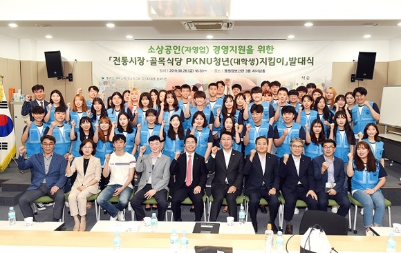 부경대학교가 전통시장을 활성화하고 경영난을 겪는 자영업자들을 돕기 위해 28일 ‘전통시장‧골목식당 PKNU청년(대학생)지킴이’ 발대식을 진행했다.