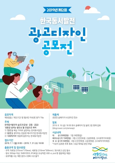 한국동서발전은 1일부터 31일까지 한 달간 ‘2019년 제2회 한국동서발전 광고디자인 공모전’을 통해 국민들의 참신한 광고 디자인 아이디어를 모집한다고 밝혔다.