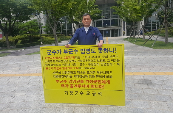 2일 정오 무렵 오규석 기장군수가 부산시청 광장 앞에서 50번째 부군수 임명권 반환을 촉구하는 1인 시위를 하고 있다. 이날 오규석 군수는 CNB뉴스 본지 기자의 질문에 “부산시가 임명권을 돌려줄 때까지 계속할 것이다. 100번이 되든 요구가 관철될 때까지 계속할 것”이라며 “부산시와는 임명권 반환에 대해 일절 소통을 하고 있지 않은 상태”라고 설명했다. (사진=변옥환 기자)